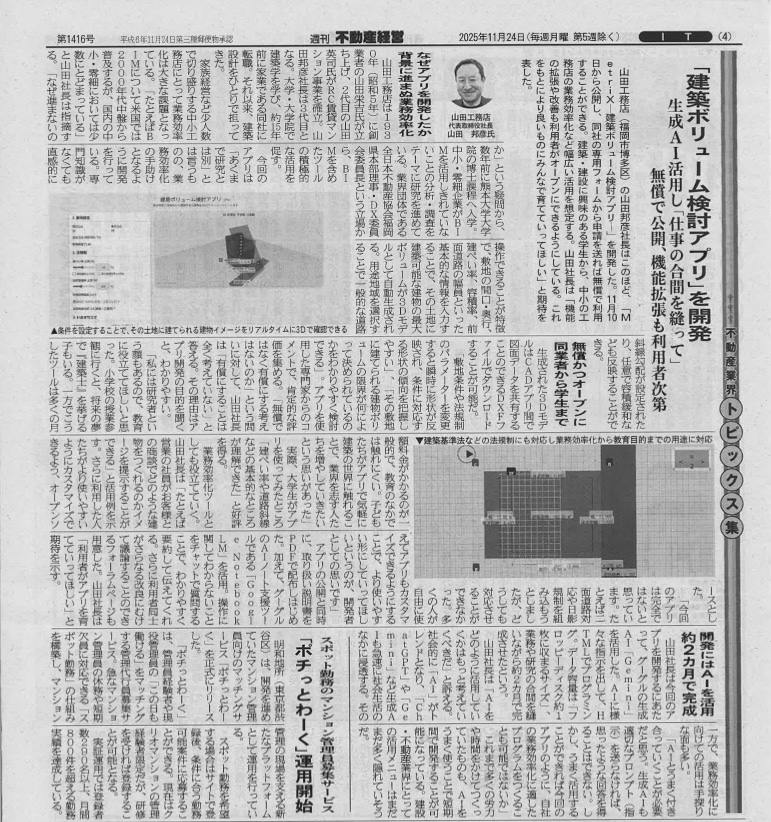 2025年11月24日 週刊不動産経営 第1416号 4面ITページに『「建築ボリューム検討アプリ」を開発 生成AI活用し「仕事の合間を縫って」無償で公開、機能拡張も利用者次第』 の記事を掲載頂きました。 ありがとうござ…