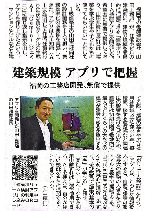 2025年12月3日 西日本新聞朝刊 7面経済ページに『建築規模 アプリで把握 福岡の工務店開発、無償で提供』の記事を掲載頂きました。 ありがとうございます 記事はこちらです